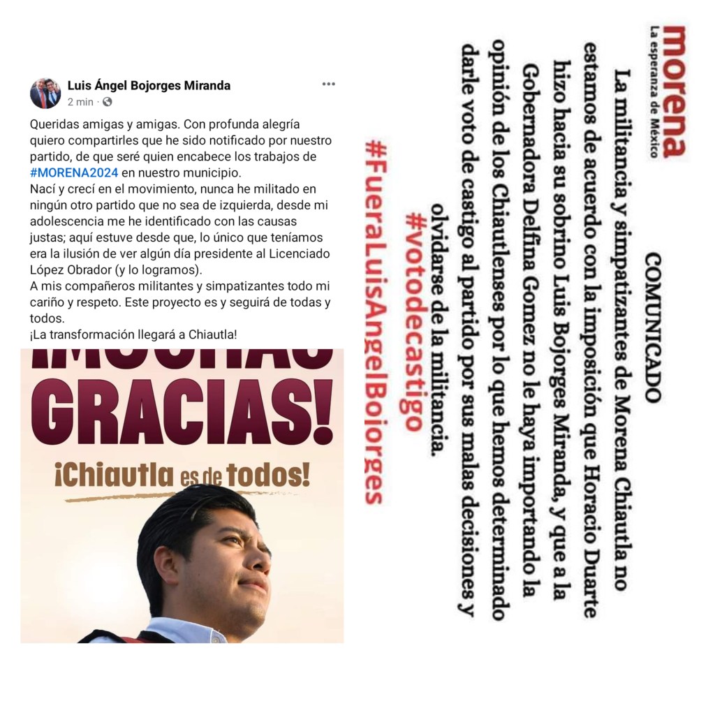 En contraparte, y a unos minutos de publicarse el comunicado. El candidato referido, Luis Ángel Bojorges Miranda, publicó en su cuenta de facebook agradeciendo la notificación de su partido Morena para encabezar los trabajos como candidato a la presidencia municipal.