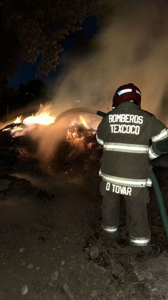 Texcoco, Edomex. 21 mayo 2024. Personal de Protección Civil, Bomberos y Atención Médica Prehospitalaria, laboraron la noche de este lunes sofocando dos incendios en predios de comunidades de Texcoco, sin que se registraran afectaciones a las personas, solo daños materiales.