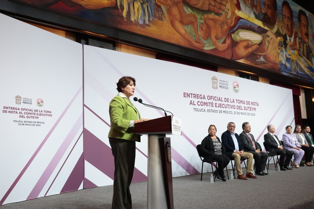 Toluca, Estado de México. La Gobernadora del Estado de México, Delfina Gómez Álvarez entregó la Toma de Nota al Comité Ejecutivo del Sindicato Único de Trabajadores de los Poderes, Municipios e Instituciones Descentralizadas del Estado de México (SUTEYM), en la que reconoció su contribución al pueblo mexiquense a través del servicio púbico y su compromiso con la justicia laboral.