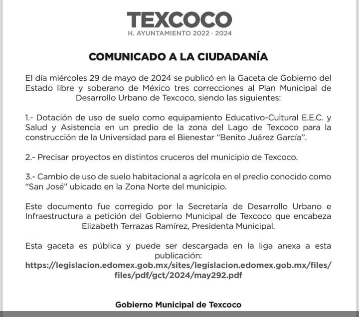 Por la tarde del día de hoy viernes 31 de mayo, el ayuntamiento de Texcoco, a marchas forzadas y bajo la presión social por las elecciones, publicó un comunicado para hacer saber a la ciudadanía en general, “La dotación de uso de suelo como equipamiento Educativo-Cultural E.E.C. y Salud y Asistencia en un predio de la zona del Lago de Texcoco para la construcción de la Universidad para el Bienestar “Benito Juárez García”. Señalando que ya había iniciado la construcción de ésta sin la dotación ni el cambio de uso de suelo. Claramente de manera ilegal, a lo que están acostumbrados los tres niveles de gobierno.