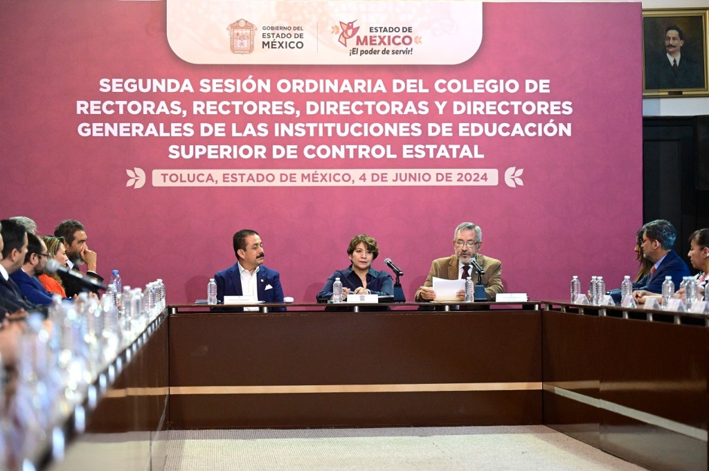 TOLUCA, Estado de México.- Las instituciones de educación superior son el principal motor de cambio para lograr una educación más inclusiva, equitativa y de calidad aseguró la Gobernadora Delfina Gómez Álvarez al participar en la Segunda Sesión Ordinaria del Colegio de Rectoras, Rectores, Directoras y Directores Generales de las Instituciones de Educación Superior de Control Estatal.