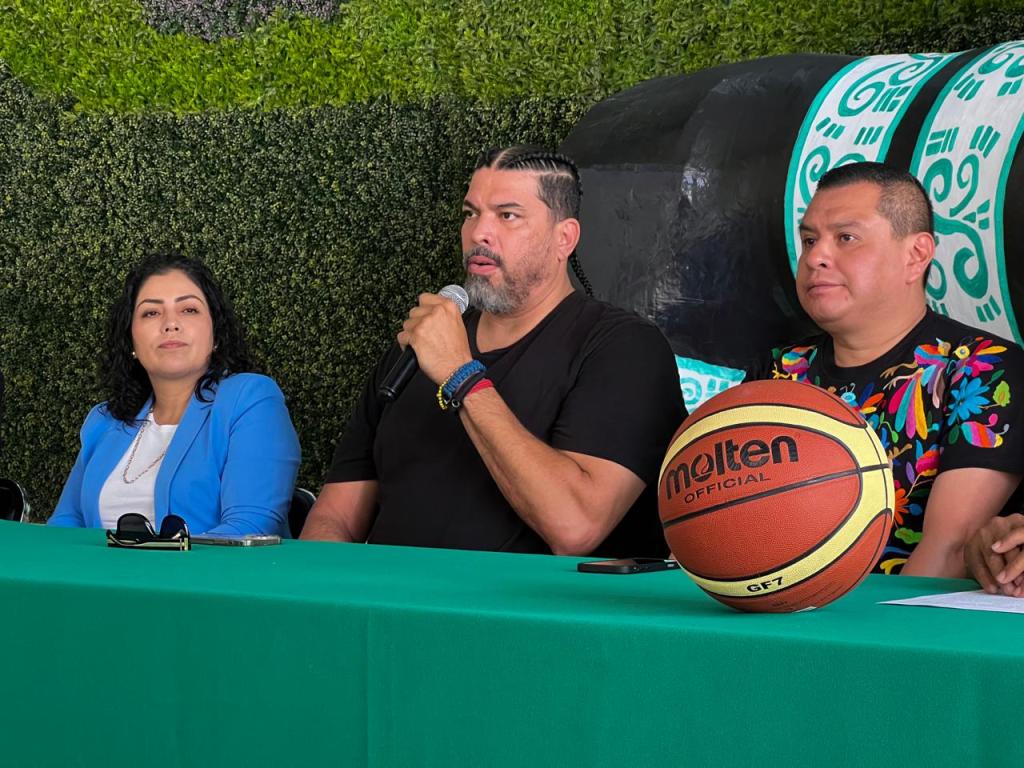 Texcoco, Edomex. 17 junio 2024. El primer jugador mexicano en la NBA, Horacio Llamas, llegó a Texcoco, en donde impartió la clínica de fundamentos de basquetbol para niños y jóvenes, la cual fue nombrada con el propio nombre del basquetbolista, quien por la mañana en conferencia de prensa destacó la importancia del deporte en el desarrollo de niños y jóvenes.
