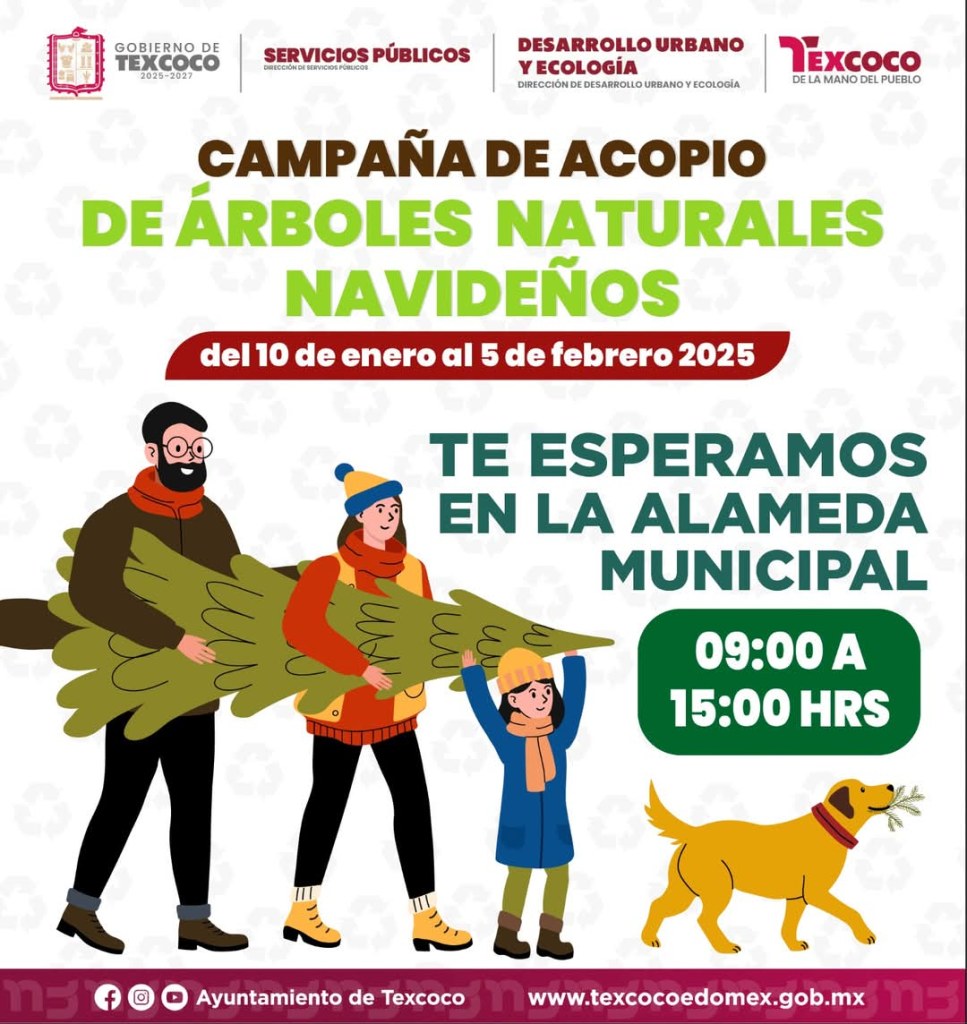 De acuerdo a las indicaciones del presidente municipal Nazario Gutiérrez Martínez, la dirección de servicios públicos y la dirección de desarrollo urbano y ecología, trabajan en coordinación para realizar el acopio de los árboles, donde los habitantes que deseen podrán llevarlos a la Alameda municipal para ser triturados y después utilizados como composta para las áreas verdes del territorio de Texcoco.