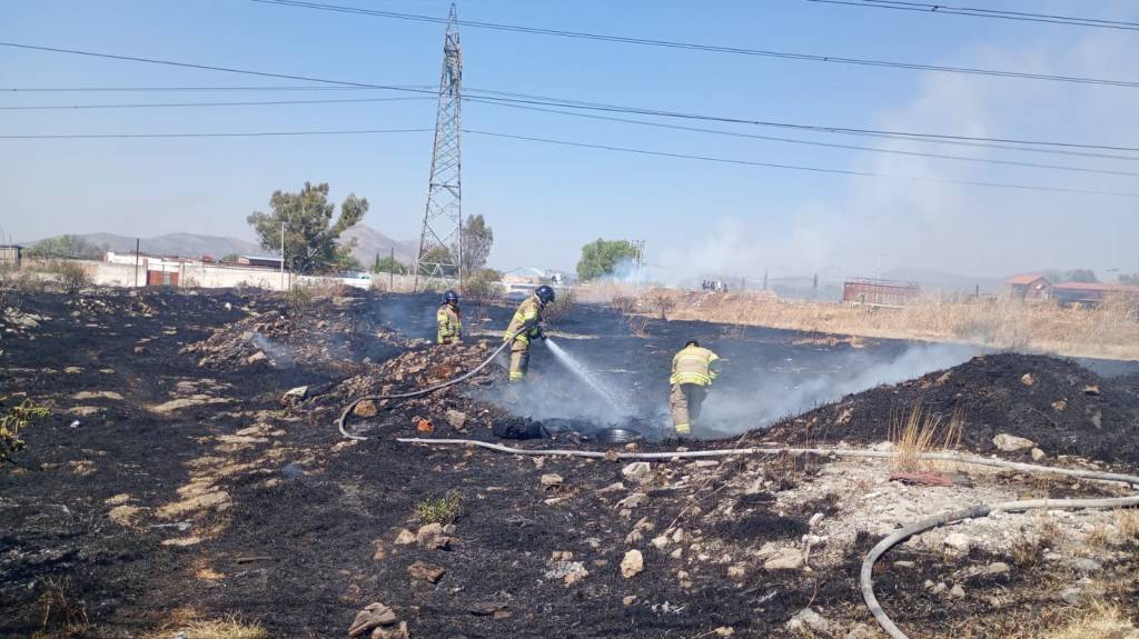 De acuerdo personal de bomberos, el incendio del pastizal alcanzando una llantas y un montón de aserrín, pero los bomberos lograron confinar el fuego y evitar que avanzara a los establecimientos comerciales.