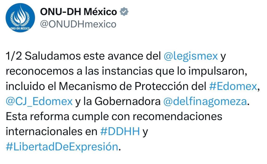 A través de su cuenta de X (@ONUDHmexico) destacó que la reforma, avalada el 6 de febrero pasado en el Congreso mexiquense, cumple con las recomendaciones internacionales en derechos humanos y libertad de expresión.