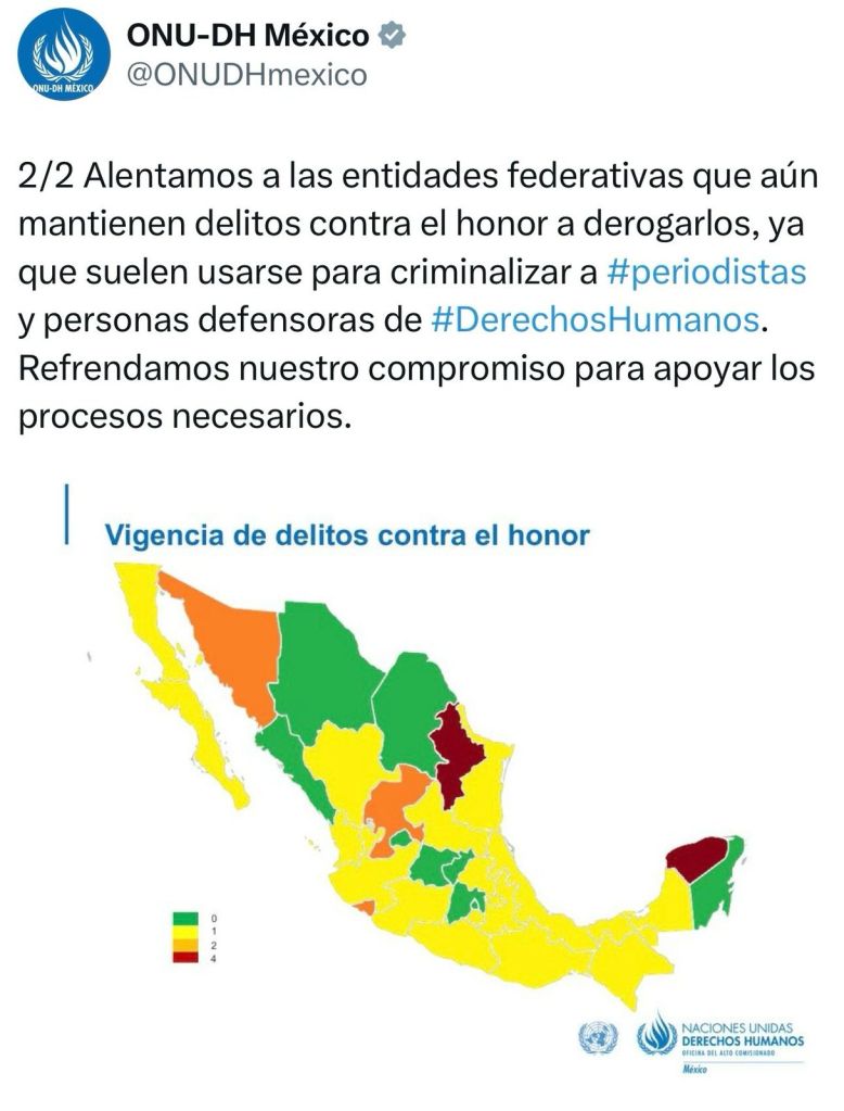 “Alentamos a las entidades federativas que aún mantienen delitos contra el honor a derogarlos, ya que suelen usarse para criminalizar a #periodistas y personas defensoras de #DerechosHumanos. Refrendamos nuestro compromiso para apoyar los procesos necesarios”, indica la publicación.