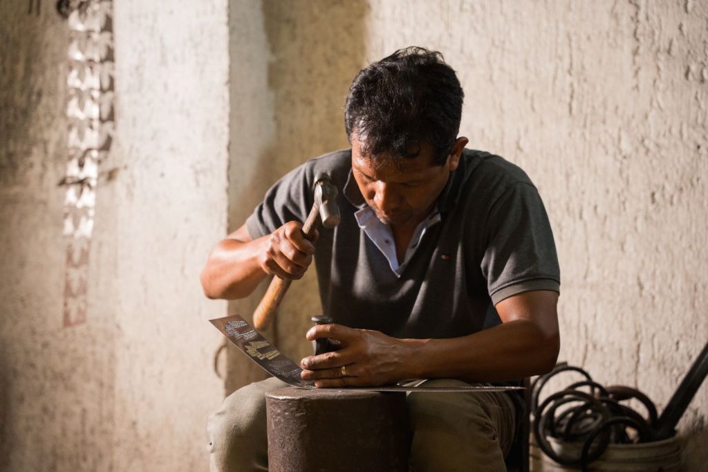 Cada figurilla metálica fue hecha de manera individual, con ayuda de marros, cinceles, limas y grabadores. El característico decorado logrado con esta técnica implica dar más de mil golpes a la lámina, por lo que es un proceso arduo que requiere gran habilidad.