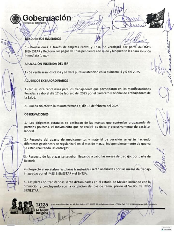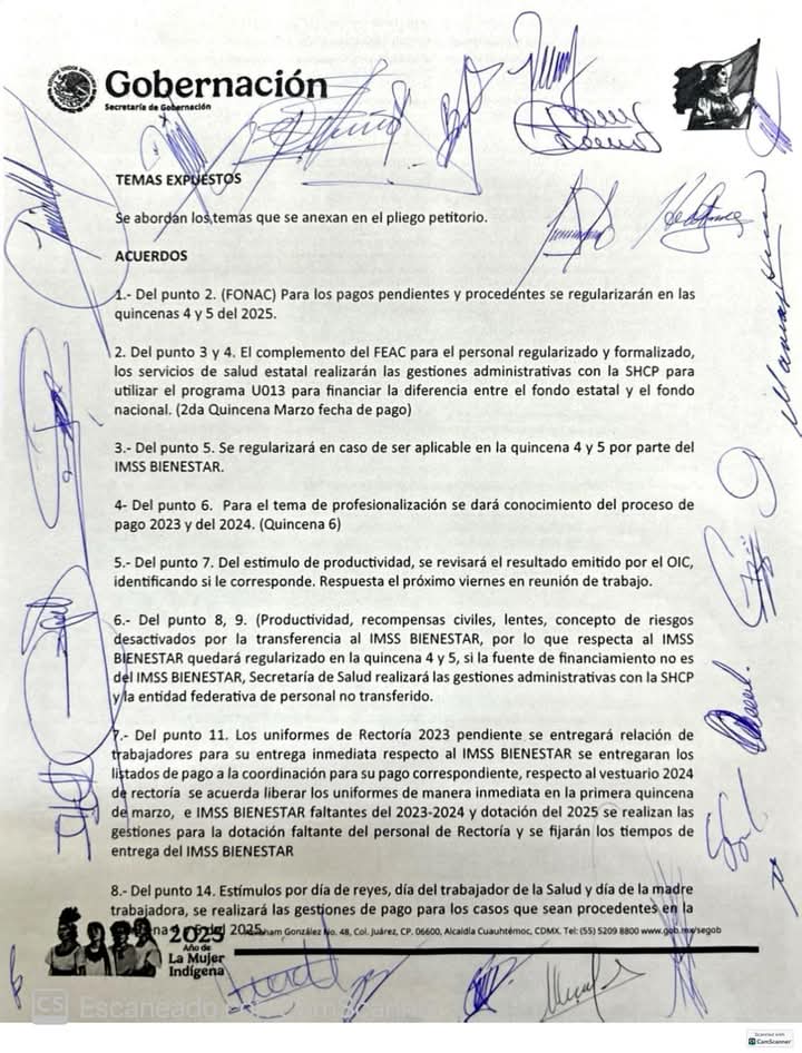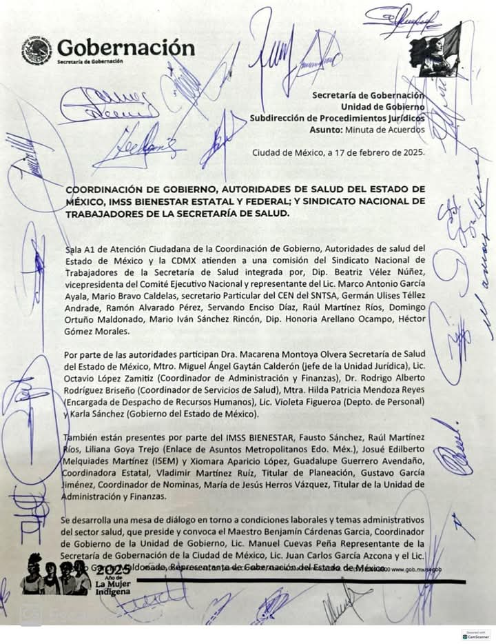 En el lugar tras varias horas de “acuerdos”, se entabló con el IMSS-Bienestar y la Secretaría de Salud mexiquense en los que se desglosan en una minuta para continuar el día 21 de febrero el tema de la basificación de personal que aún continúa en condición de contrato.