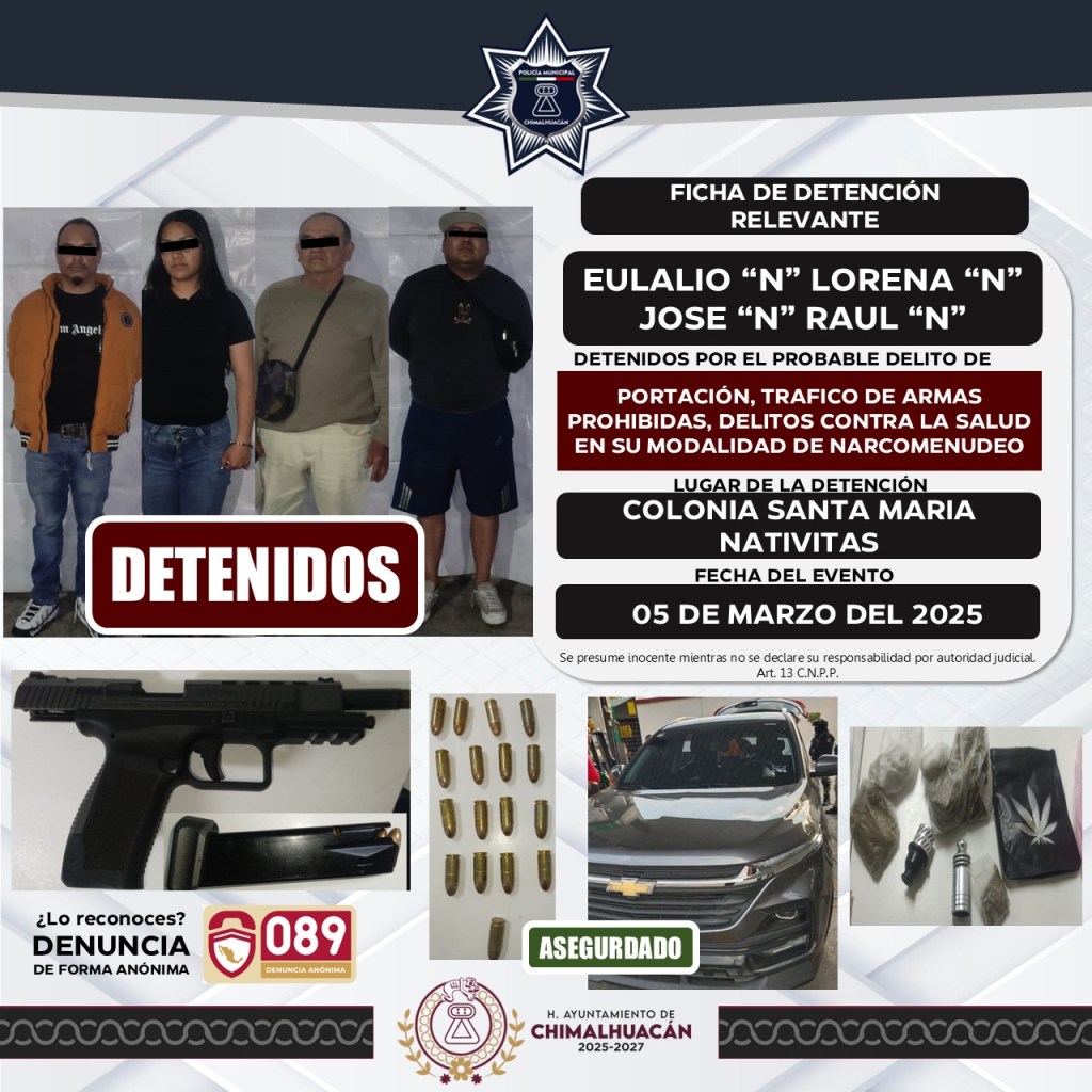 Chimalhuacán, Edomex. 7 marzo 2025. Detenidos por el probable delito de portación, tráfico de armas prohibidas, así como por delitos contra la salud en su modalidad de narcomenudeo, Eulalio “N”, Lorena “N”, Jose “N” y Raul “N”, fueron puestos a disposición de la Fiscalía General de Justicia del Estado de México (FGJEM), donde se definirá su situación jurídica.