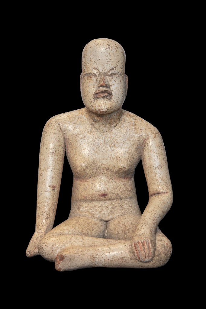 Se trata de la representación, en barro modelado, de un personaje masculino en posición sedente, con el torso desnudo y ataviado con un taparrabo. El personaje lleva las piernas cruzadas, mientras que una de sus manos sostiene su rodilla; presenta deformación craneal y rasgos típicos de la cultura olmeca.