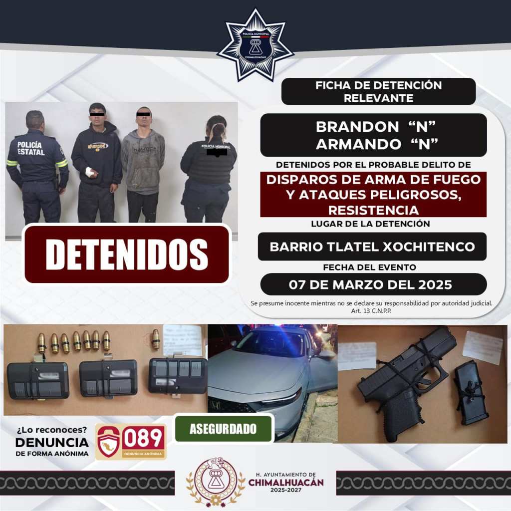 Derivado de una denuncia ciudadana recibida en el Centro de Control, Comando, Comunicación y Cómputo (C4) del municipio, se movilizaron las unidades policiales de la Región 1, correspondientes al barrio Tlatel Xochitenco, lugar donde se detuvo a los implicados.