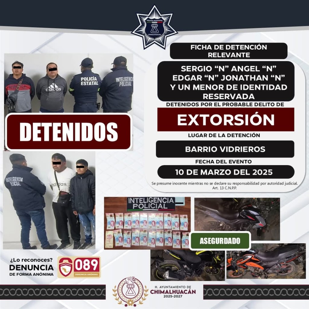 El 10 de marzo en el barrio Vidrieros, policías municipales adscritos al área de Análisis e Inteligencia, en conjunto con elementos de la Secretaría de Seguridad del Estado de México desarticularon una célula presuntamente dedicada a la extorsión y robo de motocicletas.