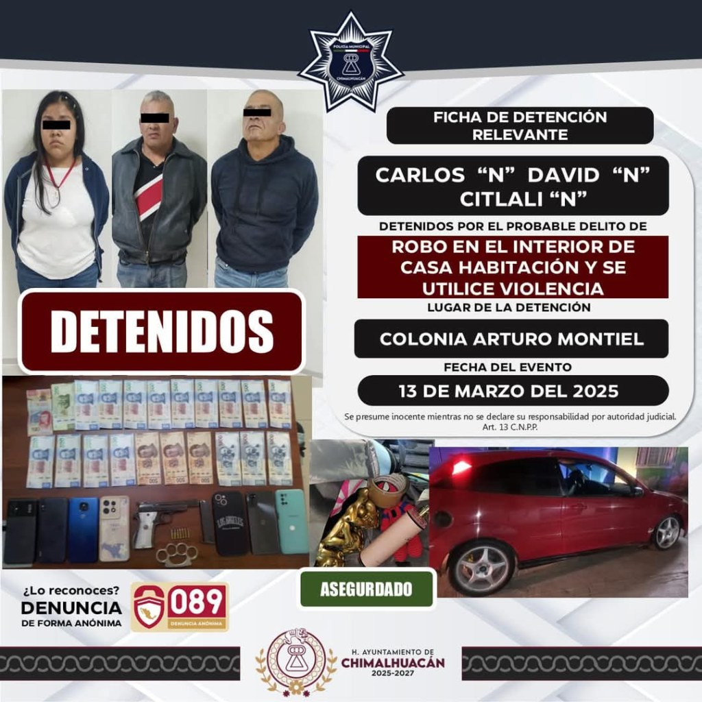 Otro delito que se combatió el 13 de marzo fue el de un robo a casa habitación, en el cual elementos de la Dirección de Seguridad Ciudadana y Tránsito Municipal, en conjunto con policías de la Secretaría de Seguridad del Estado de México, detuvieron a Carlos «N», David «N» y Citlali » N» señalados por sus víctimas de irrumpir en su domicilio para extraer sus pertenencias. Los individuos fueron puestos a disposición de la Fiscalía General de Justicia del Estado de México, encargada de definir su situación jurídica y legal.