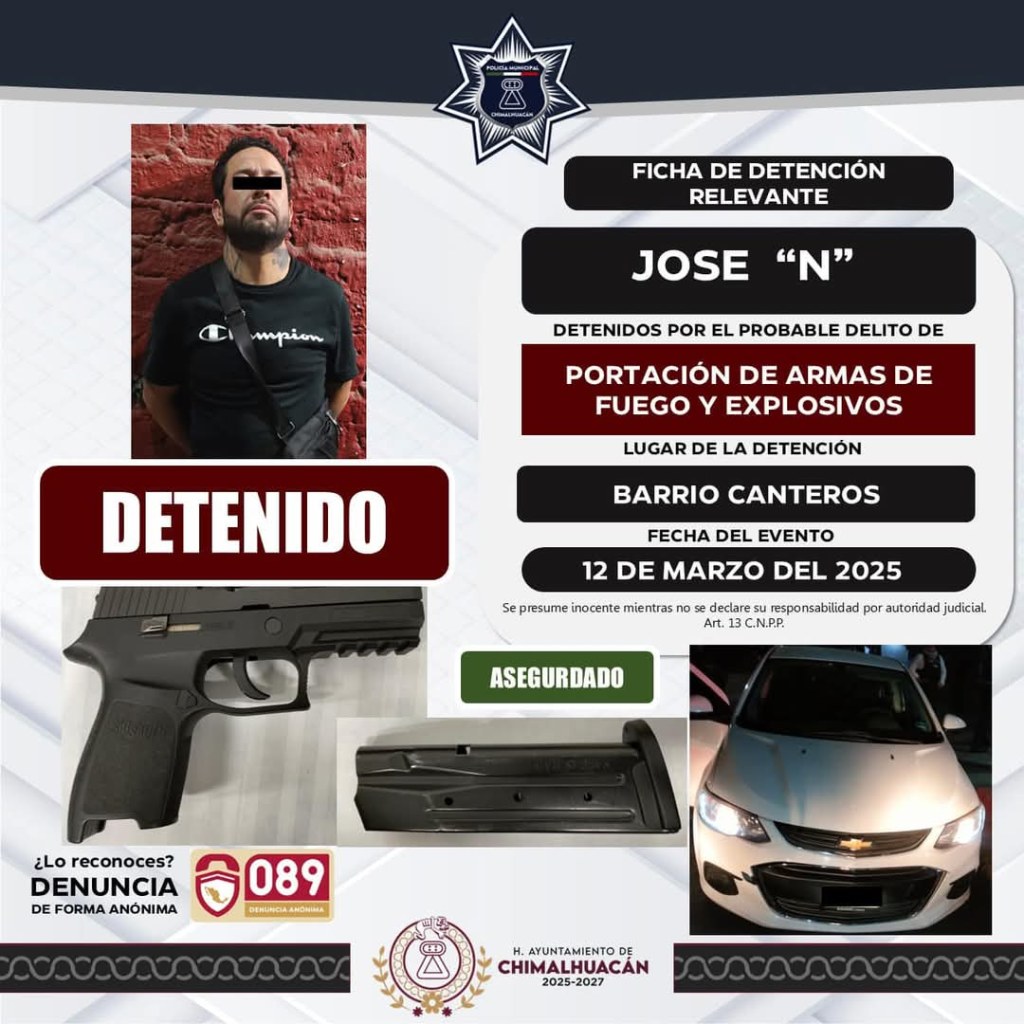 En el barrio Canteros, el día 12 de marzo y derivado de una denuncia ciudadana, elementos operativos en coordinación con el Centro de Control, Comando Comunicación y Cómputo (C4) articularon un dispositivo que permitió la detención de José «N», quien viajaba a bordo de un vehículo y portaba un arma de fuego y diversos cartuchos en sus pertenencias.
