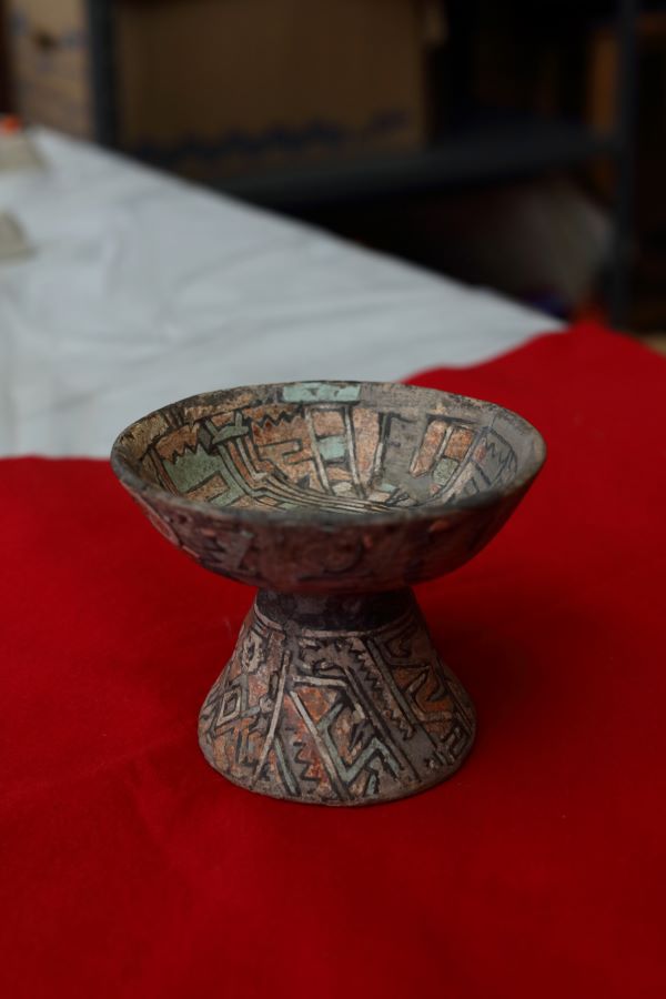 El cáliz fue hallado por el Proyecto Arqueológico Alta Vista, dirigido en ese entonces por John Charles Kelley, especialista en las culturas noroccidentales de Mesoamérica, y llegó a la Escuela Nacional de Conservación, Restauración y Museografía (ENCRyM) para su investigación y restauración, por medio de la investigadora del Centro INAH Zacatecas, Baudelina García Uranga, explicó la profesora-investigadora de la licenciatura en Restauración de dicha institución, Isabel Medina-González.