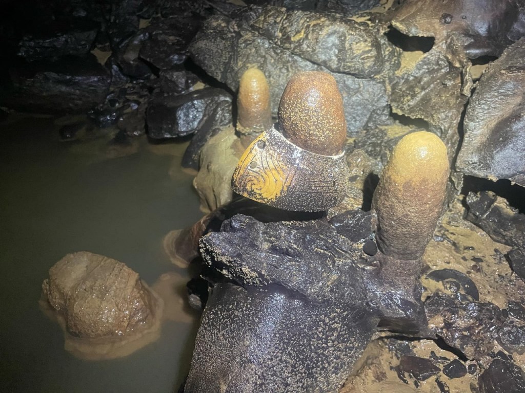 Una vez dentro de la formación natural, los expertos encontraron evidencias de que las estalagmitas fueron retocadas en época prehispánica para darles una terminación más esférica y, entre el sedimento removido por la corriente, hallaron tres discos más de piedra, dos de ellos fragmentados.