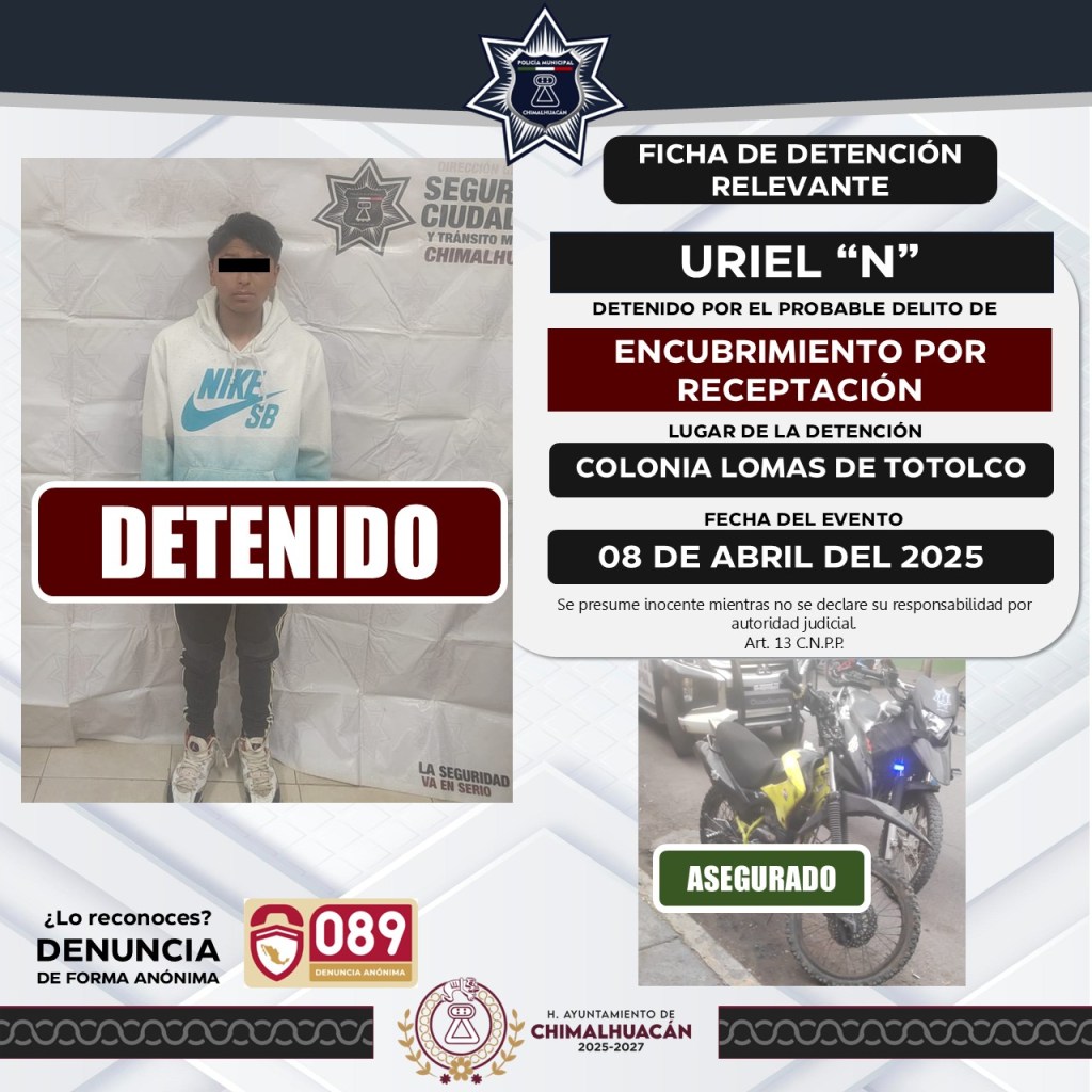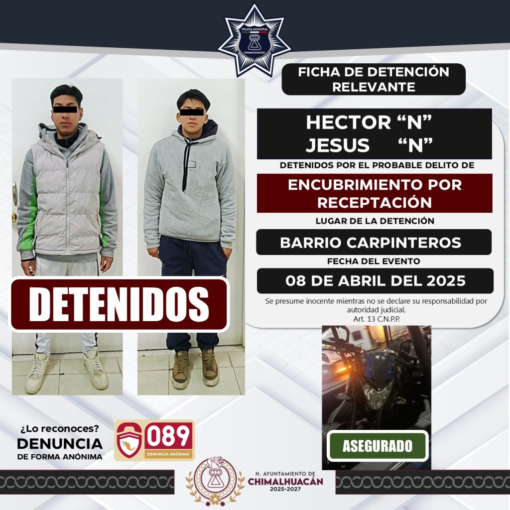 El 8 de abril, en el barrio Carpinteros, fueron detenidos por elementos de seguridad Héctor “N” y Jesús “N” por el probable delito de encubrimiento por receptación; asimismo, Uriel “N” fue detenido en la colonia Lomas de Totolco por el mismo delito.