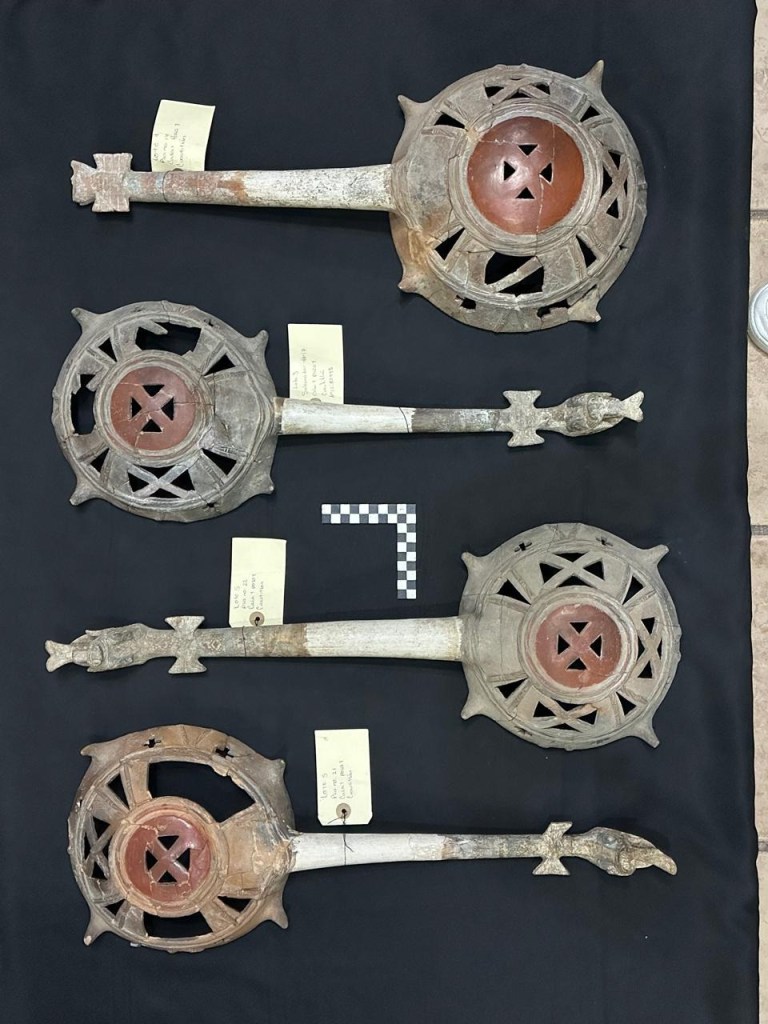 En este último, bajo la coordinación de Josué Alcántara Morales, el proceso de restauración de cada una de las piezas, que implicó la identificación, limpieza general y unión de fragmentos, fijado de capa pictórica, reposición de faltantes, resanado y reintegración cromática, se hizo por temporadas, entre 2022 y 2024.