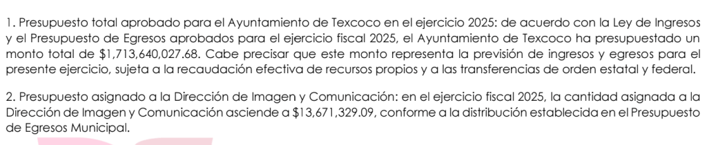 Texcoco, Edomex. 10 junio 2025. Mediante una solicitud de transparencia hecha en el mes de marzo sobre la cantidad asignada a la dirección de Imagen y Comunicación del ayuntamiento de Texcoco sobre el presupuesto designado para este año 2025.