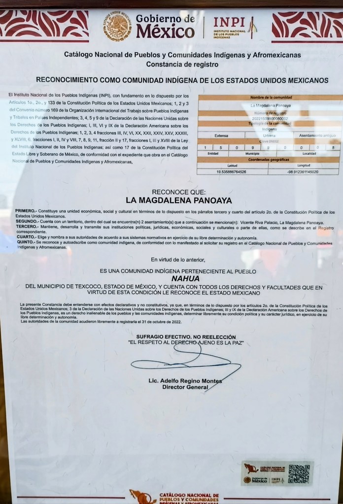 En asamblea general en la comunidad de La Magdalena Panoaya, municipio de Texcoco; se anunció el reconocimiento de este territorio como una comunidad indígena ante el Instituto Nacional de los Pueblos Indígenas (INPI), mismo respaldo que está establecido en los Artículos 1°, 2° y 133 de nuestra Constitución Política de los Estados Unidos Mexicanos, así como tratados internacionales y la Constitución Libre y Soberana de México.
